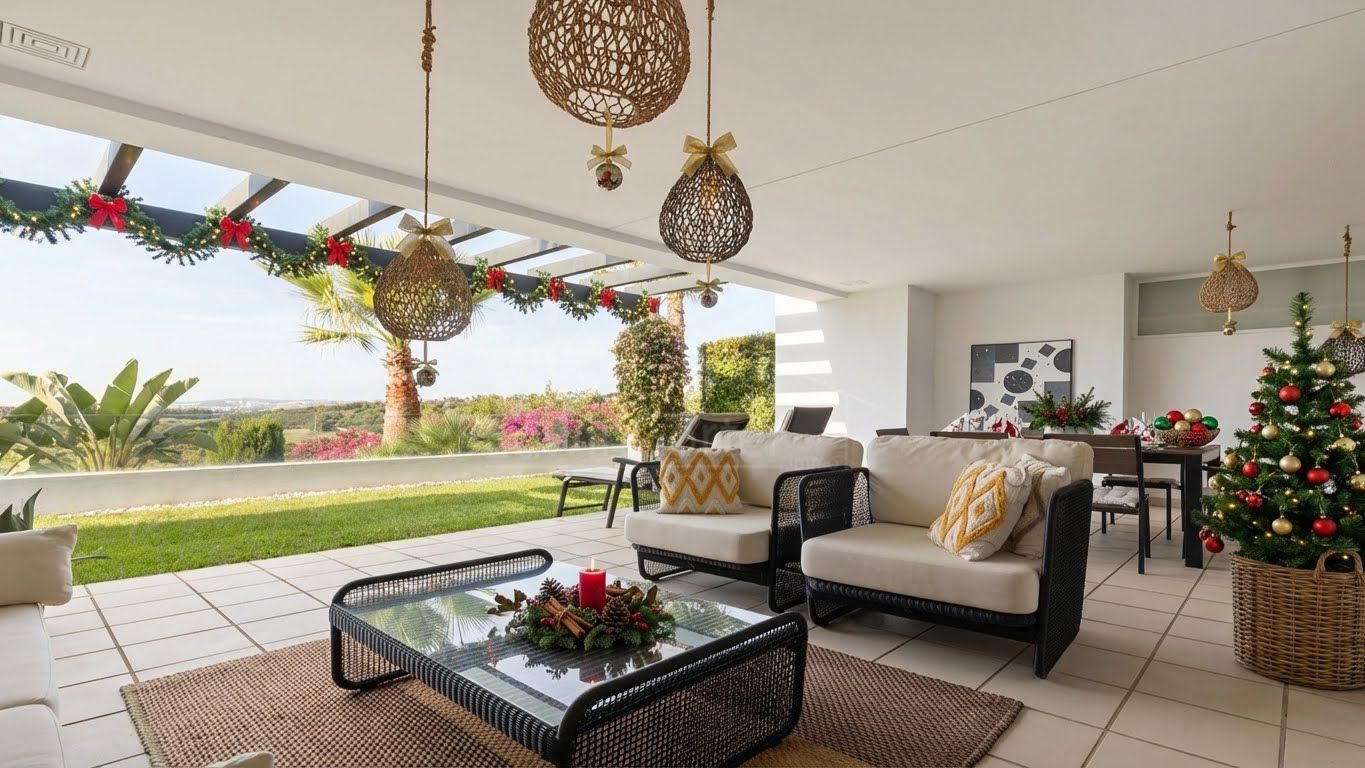 The living area flows seamlessly onto the apartment’s standout feature: a stunning terrace and garden. Partly covered, this outdoor space is perfect for al fresco dining, relaxing in the Spanish sun, or simply enjoying the serene surroundings.