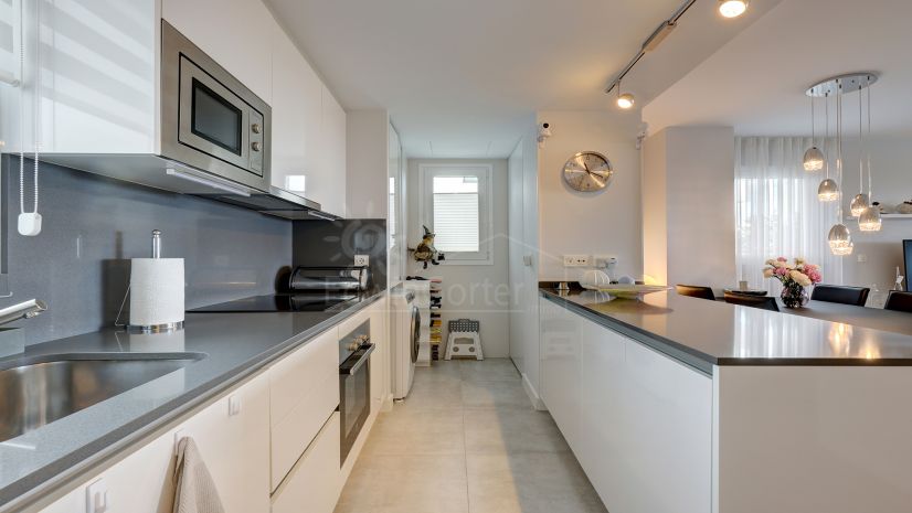De frente, el espacio abierto de cocina, comedor y salón es moderno y luminoso, y se abre a la amplia terraza, perfecta para cenar al aire libre o disfrutar de las largas tardes soleadas de España, deleitándote con las impresionantes vistas al mar.